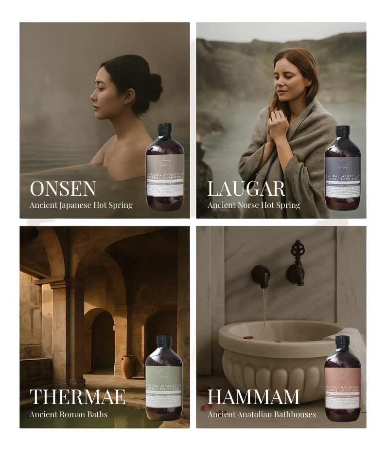 Each blend draws on the wisdom of centuries-old bathing traditions from around the world: Thermae, Hammam, Laugar, Onsen