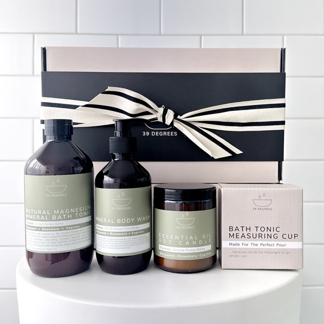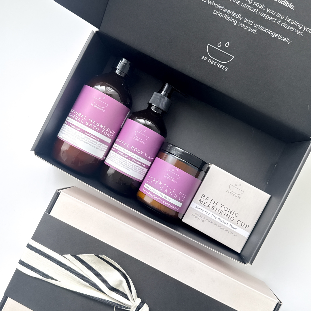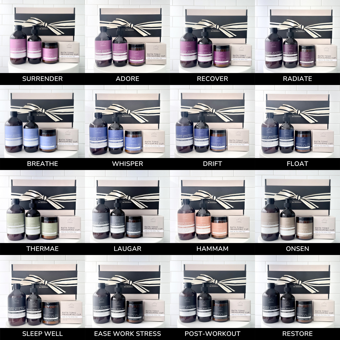 Inside, you’ll find your choice of 500ml Bath Tonic paired with the matching 300ml Body Wash and signature Essential Oil Soy Candle - all designed to layer scent and deepen calm. We’ve also included our ceramic tonic measure to help you pour the perfect amount every time.
