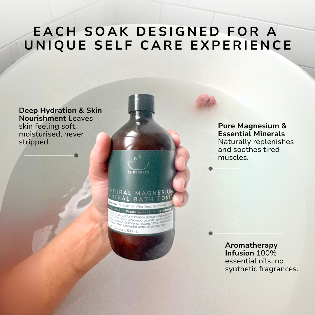 Pour. Soak. Breathe. Add 100mL to warm water. Let the minerals do the rest.