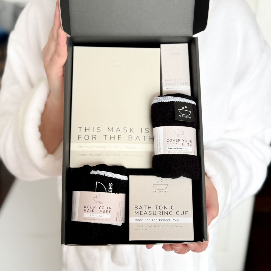 From Silk Scrunchies and Ultra-Soft Privacy Towels to our Luxe Ceramic Bath Tonic Measuring Cup, this set makes every bath, mask and magnesium moment feel a little more elevated.